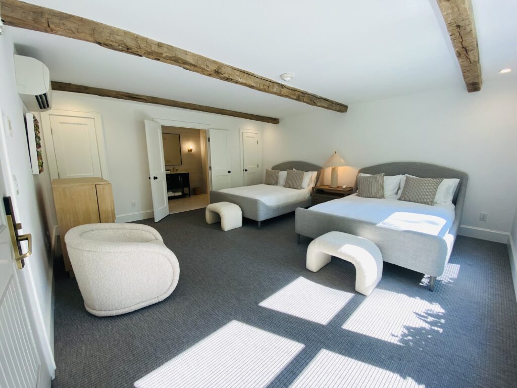 Experience luxury at its finest in our Double Queen Suite, offering generous space, an ensuite bathroom, and ample closet storage. Designed for comfort and elegance, this suite comfortably accommodates up to four guests and features access to a private courtyard and a charming upstairs covered seating area—perfect for relaxing moments throughout your stay.